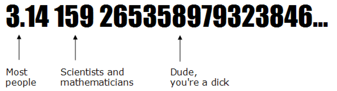Here’s a fun game: ask a friend what pi is. Some people will say “3”. Many have learned that π is the ratio 22/7. Still others, probably the kids who think they’re smart, will say “3.14”. If you were to ever ask me, ever since I was a little kid, I’d tell you that it is “3.141592863”. That’s because I tend to be a pretentious jerk who found things like this impressive, but I only learned that about myself as I got older. At the time, I thought it was pretty cool to know that many digits. I have many friends that know π out to 10, 50, even 100 or more digits. What can I say? We usually had no problem picking up the girls at parties. It’s a gift.
