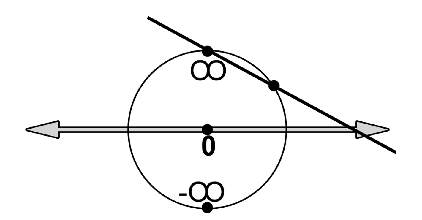 Do you have to have numbers in order to have a system of math? Nope. We’ve arbitrarily made numbers, and the relationship they have among themselves are stable for all four arithmetic operators, with one exception: 1/0, which is undefined. Instead of a labeled line, we could construct our number system differently to show why anything divided by zero doesn’t work geometrically. Here we have a system with only three concepts, zero, infinity, and theta. By drawing a line from infinity through some point on the circle we can uniquely identify all of the real numbers just with theta. Any number divided by zero is not a number; the line would be parallel to our number line. It is not part of our system. Look, ma, no integers! We don’t have to have numbers to have math, and we don’t have to have words to have language and intelligence, it’d just operate under vastly different rules … and still the same problems would be there. (We just wouldn’t use language as we know it to solve them)